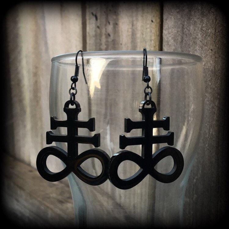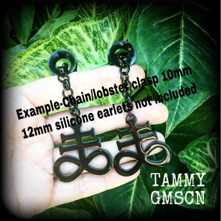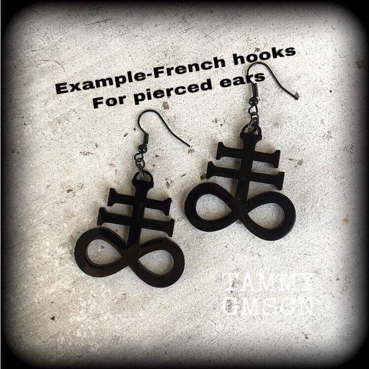 The 'Sigil of Sulphur' ear hangers are nice and dangly but not too big, weighing 13 grams each (not too heavy, not too light), and made on french hooks to be worn in pierced ears.