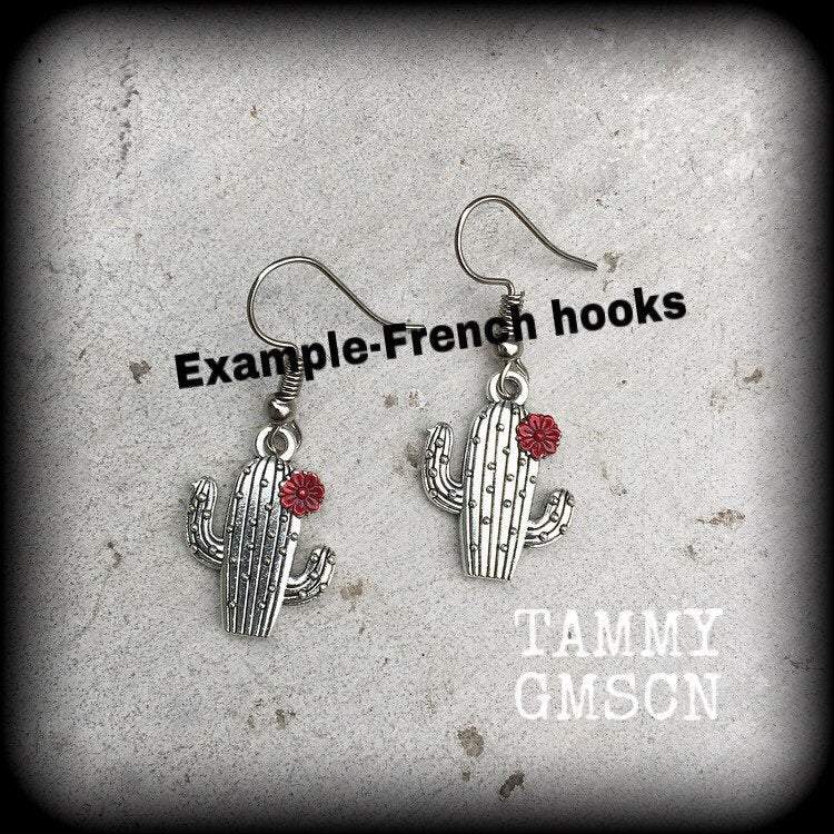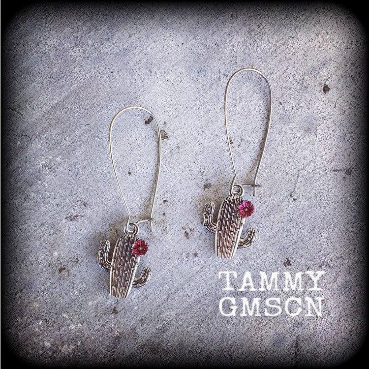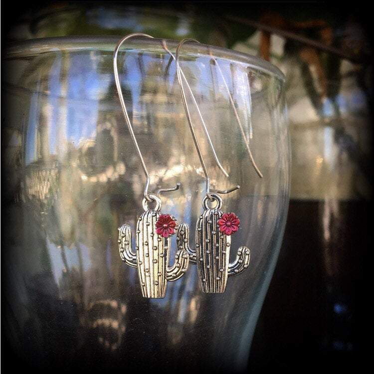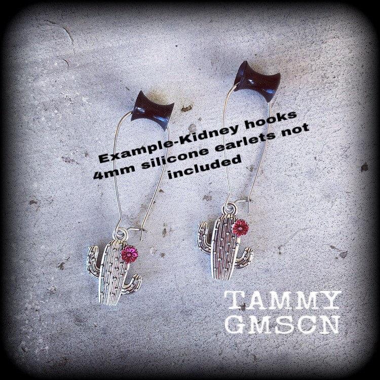 Measuring just on 5cms from top to bottom these earrings feature a classic prickly cactus with a quirky little red flower. These have been made on antique silver kidney hooks, for pierced ears or to be worn in stretched lobes with silicone earlets.