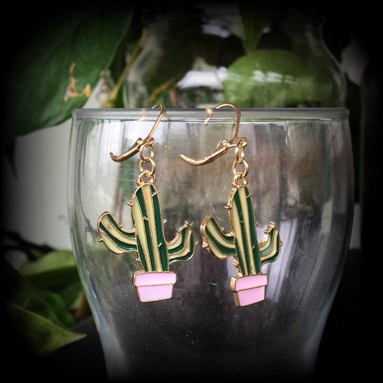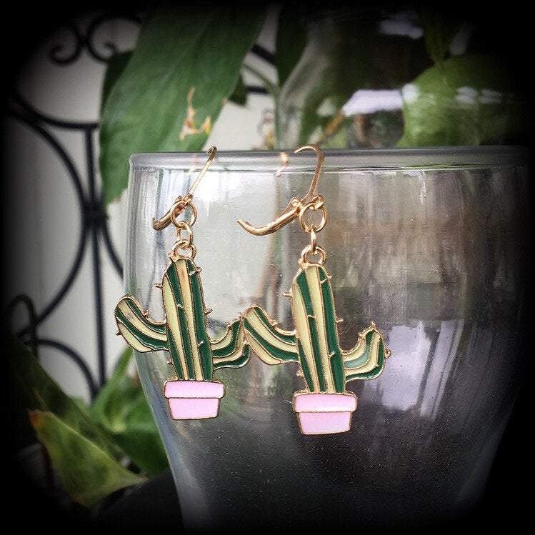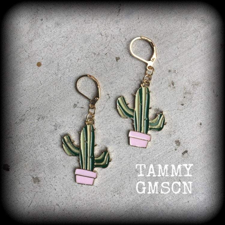 Measuring just on 5.5cms from top to bottom these earrings feature a classic prickly green cactus sitting in a cute pink pot. These have been made on a boho gold leverback hooks, to be worn in pierced ears, or stretched lobes in silicone earlets,