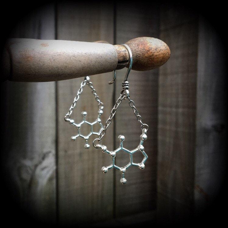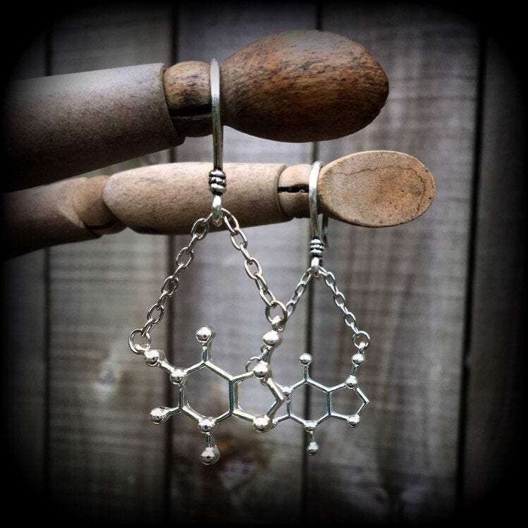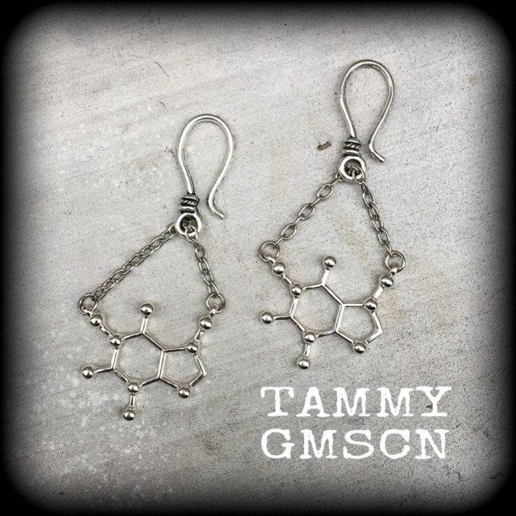 Caffeine ear hangers Molecule ear weights 3mm tunnel dangles 4mm plug dangles 5mm plug earrings 6mm tunnel earrings 8mm gauged earrings 0g