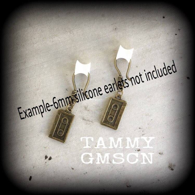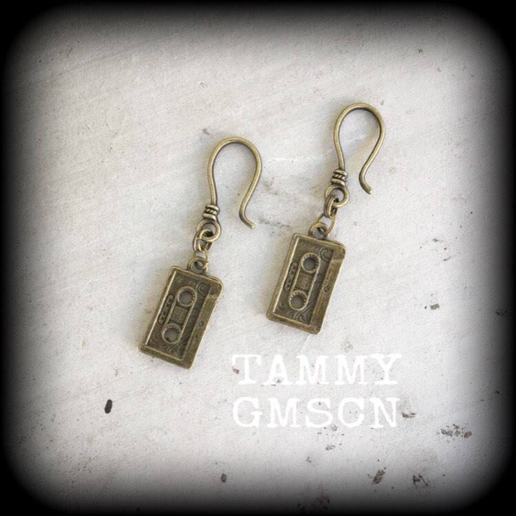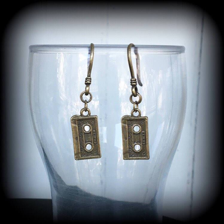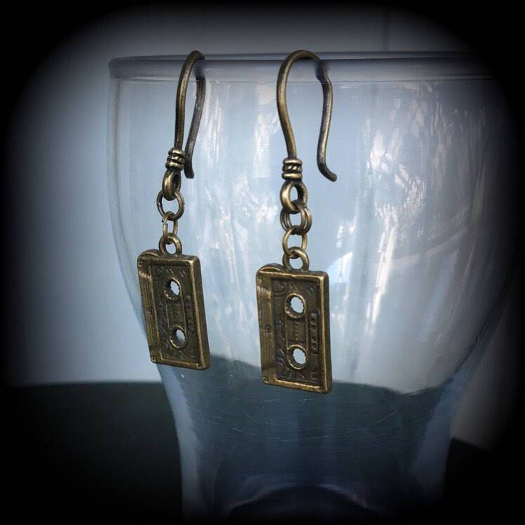 Super cute and super light weight, the antique bronze 'Cassette Tape' earrings measure just on 5cm from tip to tip and have been made on small antique bronze shephard hooks, to be worn through stretched ears with silicone earlets.