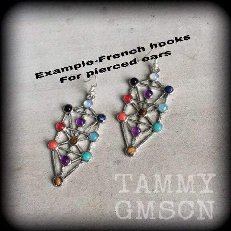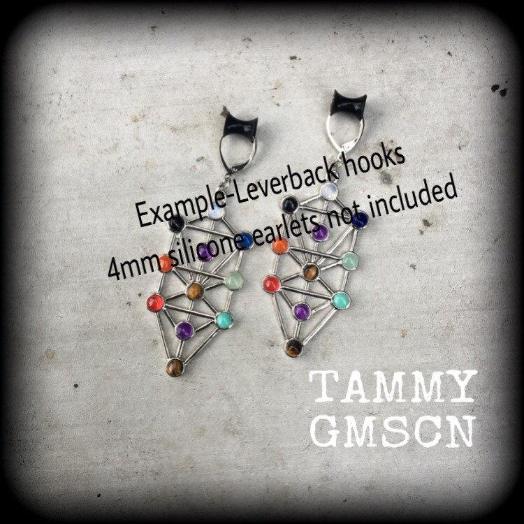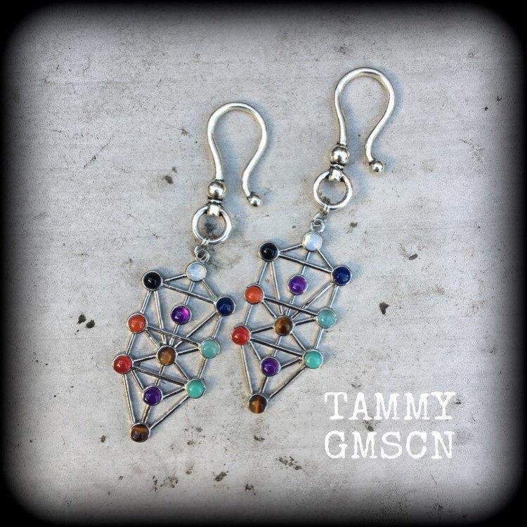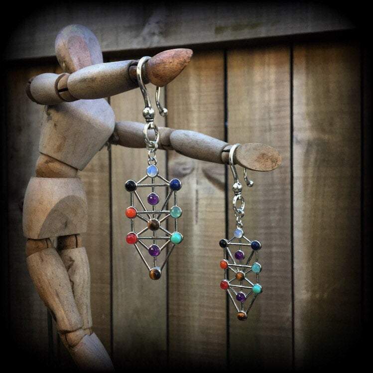 The Tree of Life Chakra ear hangers are lightweight, weighing only a few grams each, featuring the Tree of Life charm, encrusted with gemstones corresponding to the 7 chakras, Amethyst, Aquamarine, Sodalite, Peridot, Citrine, Carnelian, and Garnet, on a large antique silver shepard hook to be worn through silicone earlets in stretched lobes from 6mm/2 gauge.