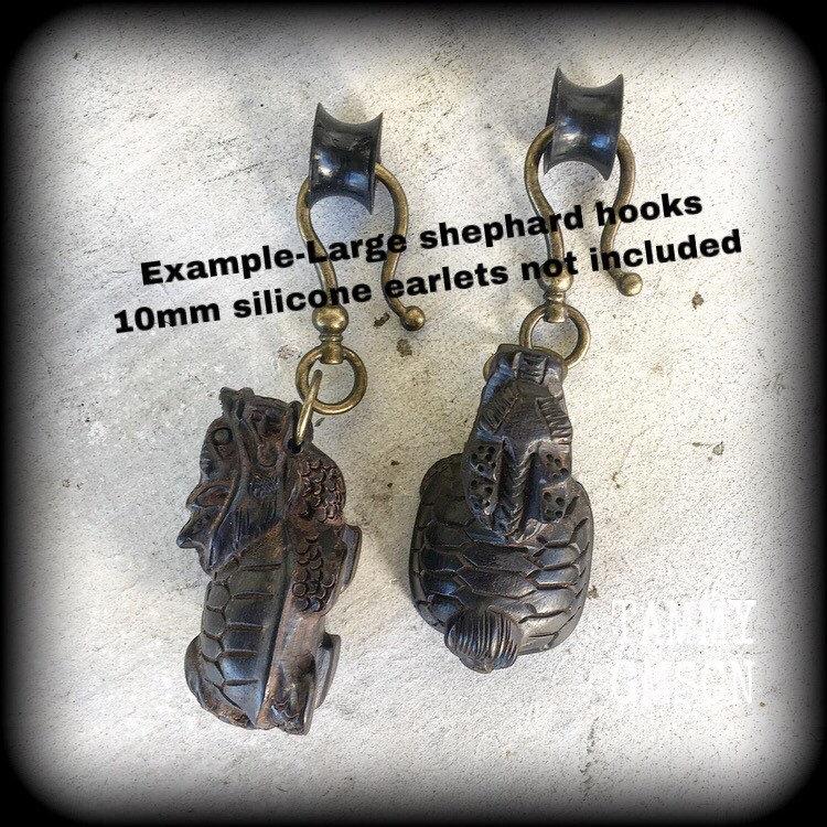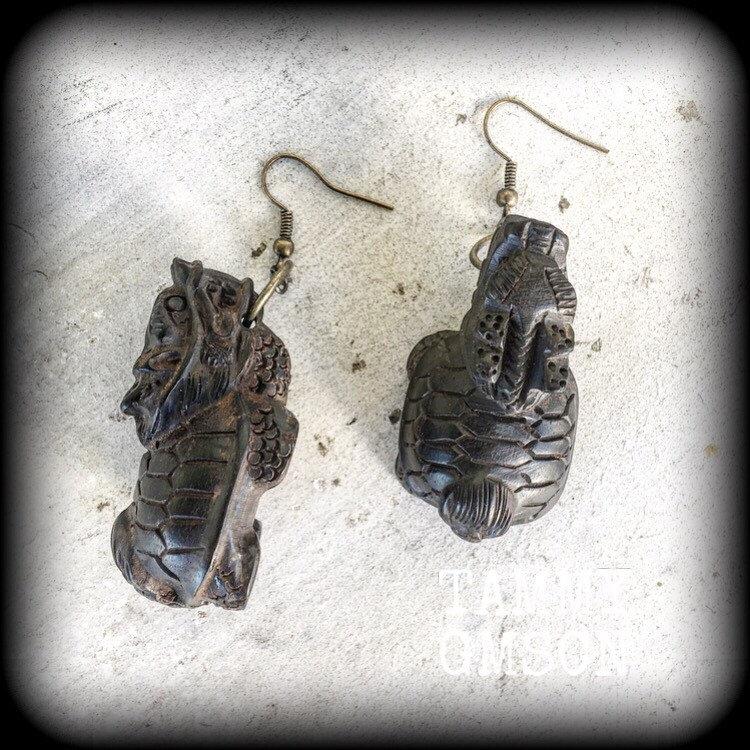 This is a pair of gorgeous carved ebony wood Dragon Turtle earrings, nice and lightweight, weighing only 16 grams each and measuring just on 7cms from tip to tip, making them perfect for pierced ears, and light weight ear weights.