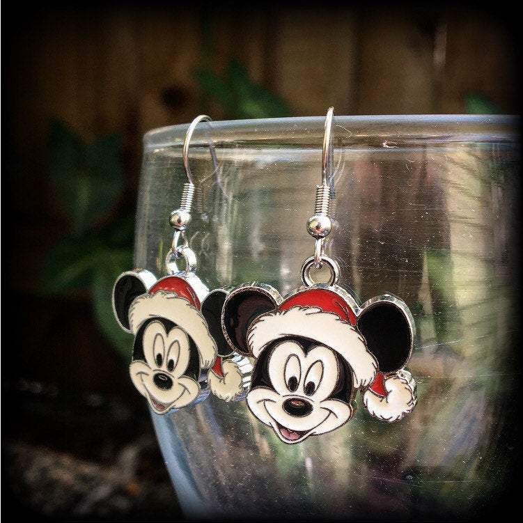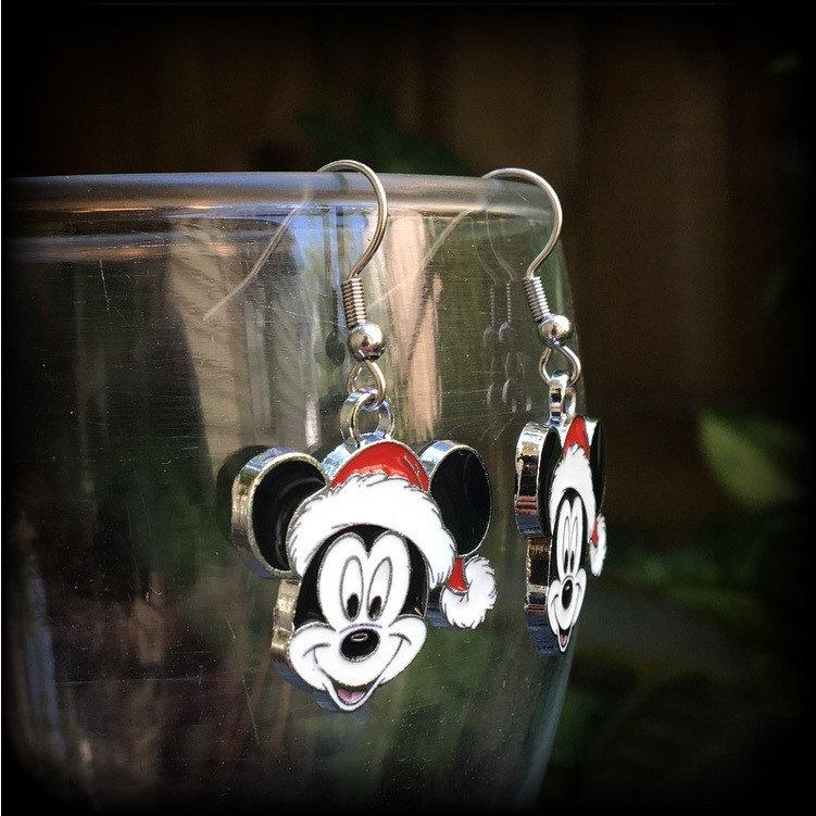 Super cute super lightweight antique silver and enamel Mickey Mouse Santa Claus charms made on antique silver french hooks for pierced ears, perfect for Christmas.