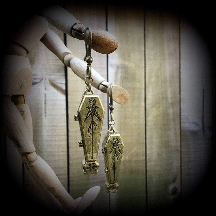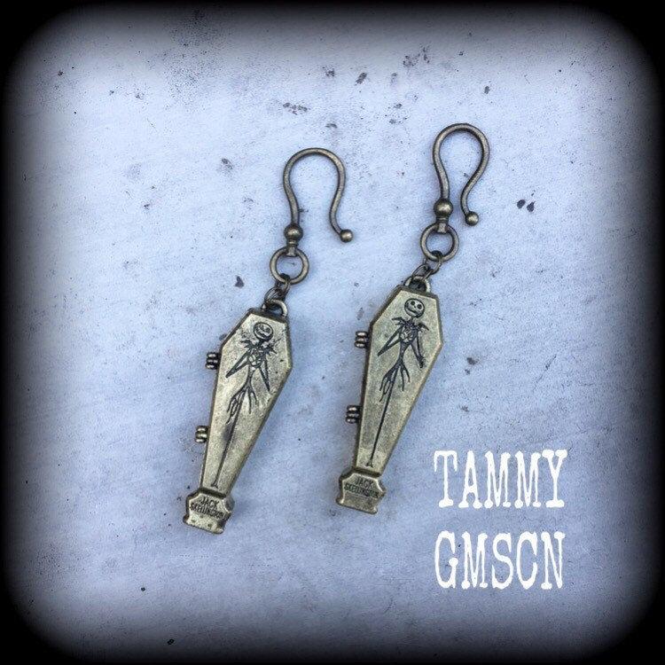 The Halloween 'Skellington' Antique Bronze Coffin ear weights have been made with large antique silver shephard hooks, to be worn through silicone earlets in stretched lobes from 2 gauge/6mm.