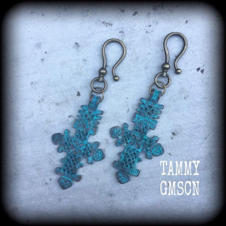 Measuring just on 9cms from tip to tip, this pair of ear hangers feature an ornate Verdigris Patina 'Ancient Ones Cross' with antique bronze beads, made on large antique bronze shephards hook to be worn through stretched lobes with silicone earlets...