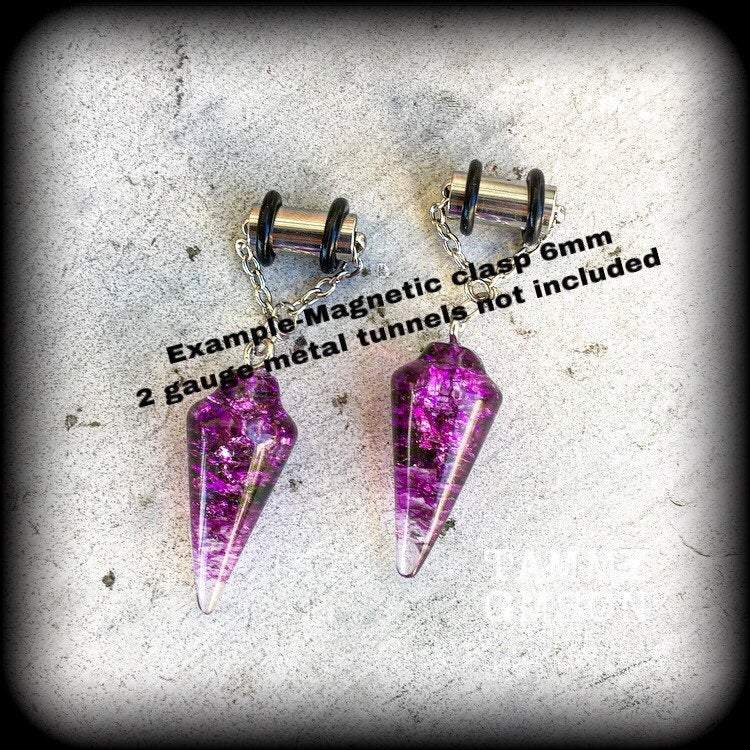 These earrings are with gorgeous purple quartz divination pendulums and antique silver chain, fastening with an antique silver magnetic clasp (6mm), to be worn in metal tunnels or silicone earlets 2 gauge and larger.