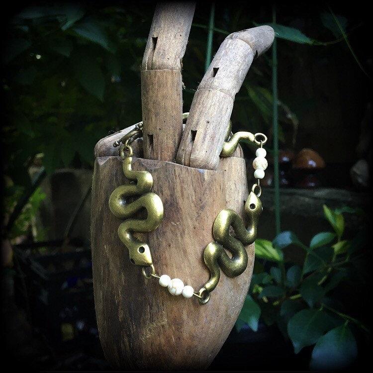 Featuring 3 antique bronze snake charms moulded to fit your wrist with small bone white howlite stone beads, this bracelet measures just on 21cms from tip to tip when laid flat and fastens with a bronze tone toggle clasp.
