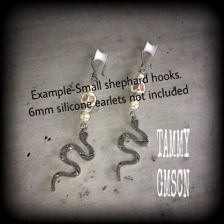 I recommend shephard hooks be worn through silicone earlets in stretched lobes as they fit snug and look great, while chain and clasps are more suitable to be worn through metal tunnels.