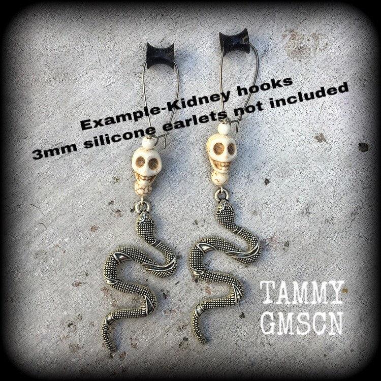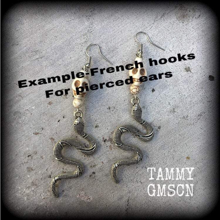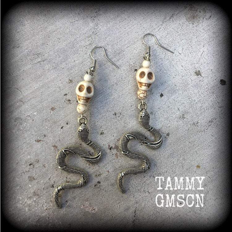 These earrings feature a gorgeous ornate tribal antique silver snake with a small bone white stone skull.