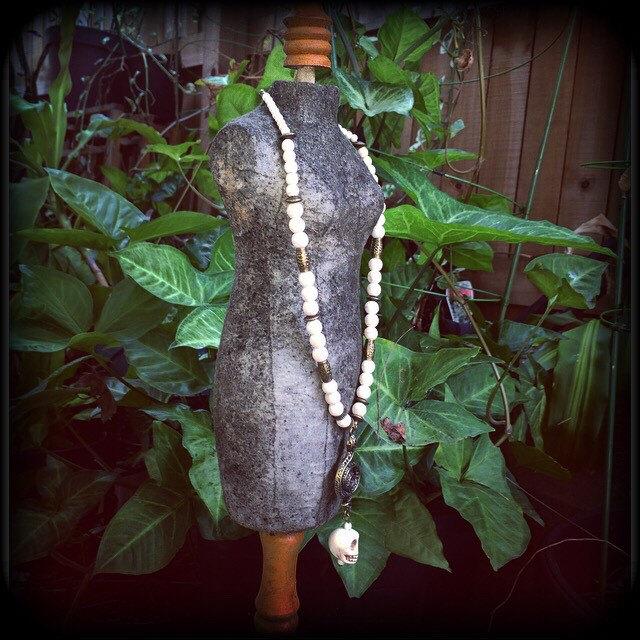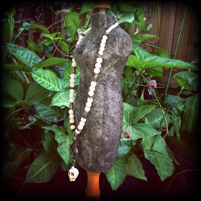 Featuring a gorgeous antique bronze 'Ascending snake' with a large bone white howlite stone skull, on a strand of bone white stone beads dotted with ornate antique bronze beads, this necklace measures 43cms from tip to tip when laid flat and fastens with an antique bronze toggle clasp.
