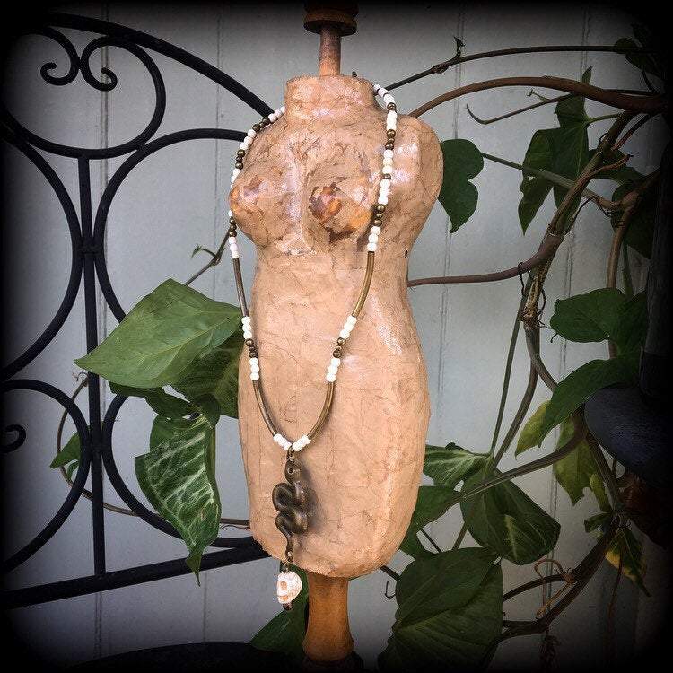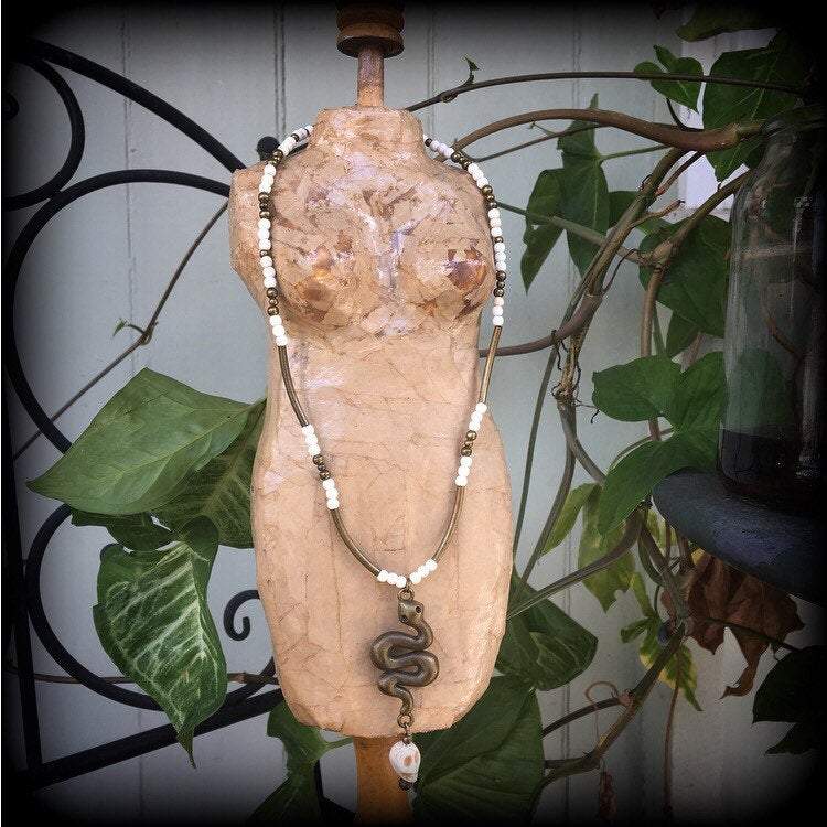 Featuring a gorgeous antique bronze 'Ascending snake' with a bone white howlite stone skull, on a strand of bone white stone beads dotted with antique bronze beads, this necklace measures 44cms from tip to tip when laid flat and fastens with an antique bronze toggle clasp.
