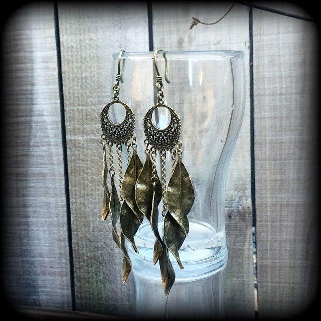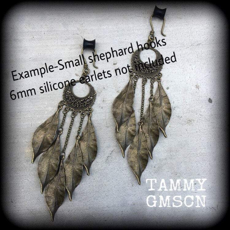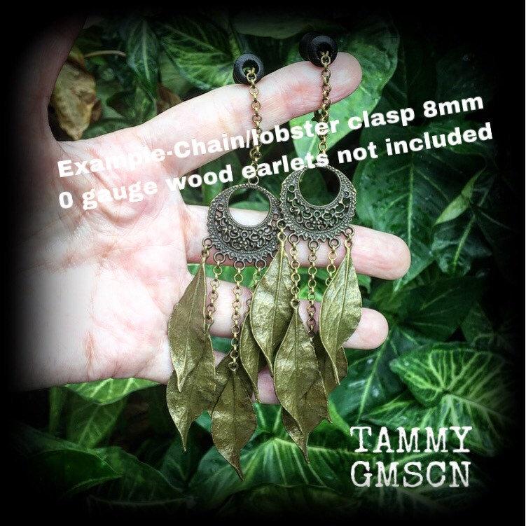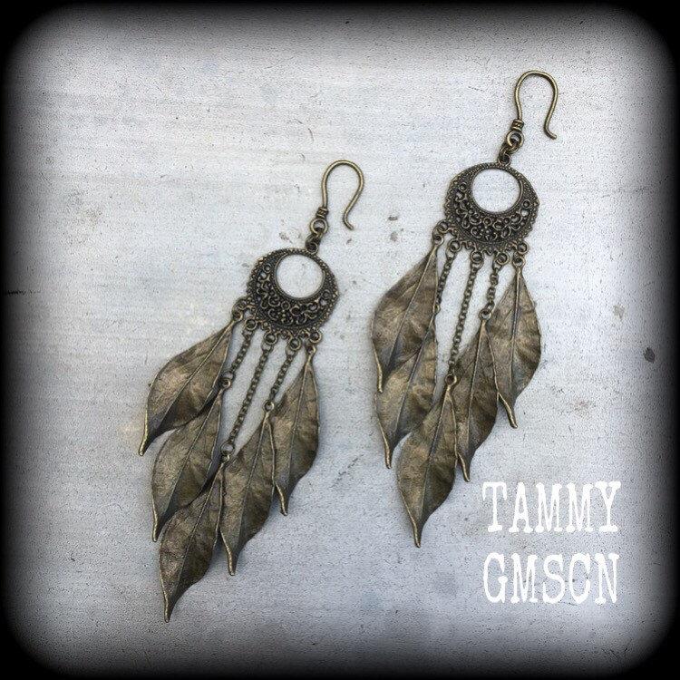 Featuring gorgeous bronze leaves hanging from an ornate antique bronze charm with antique bronze chain, made with small antique bronze shepards hooks to be worn through stretched ears with silicone earlets from 3mm/8 gauge and larger.