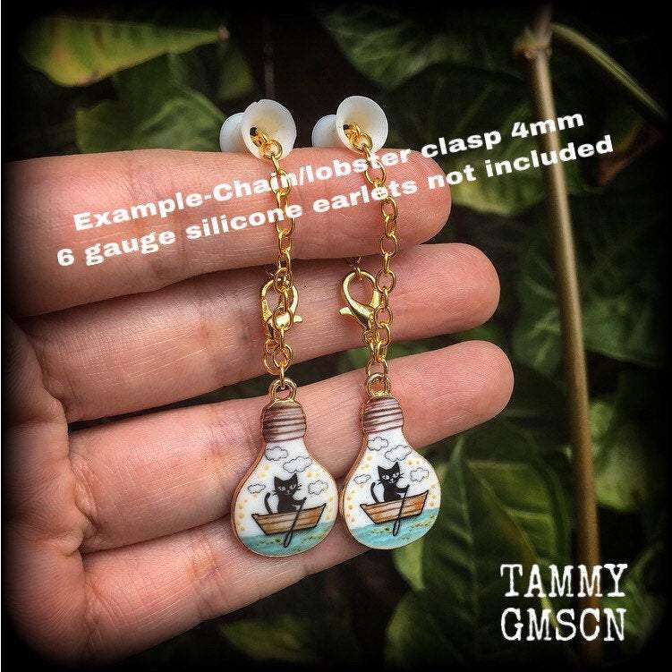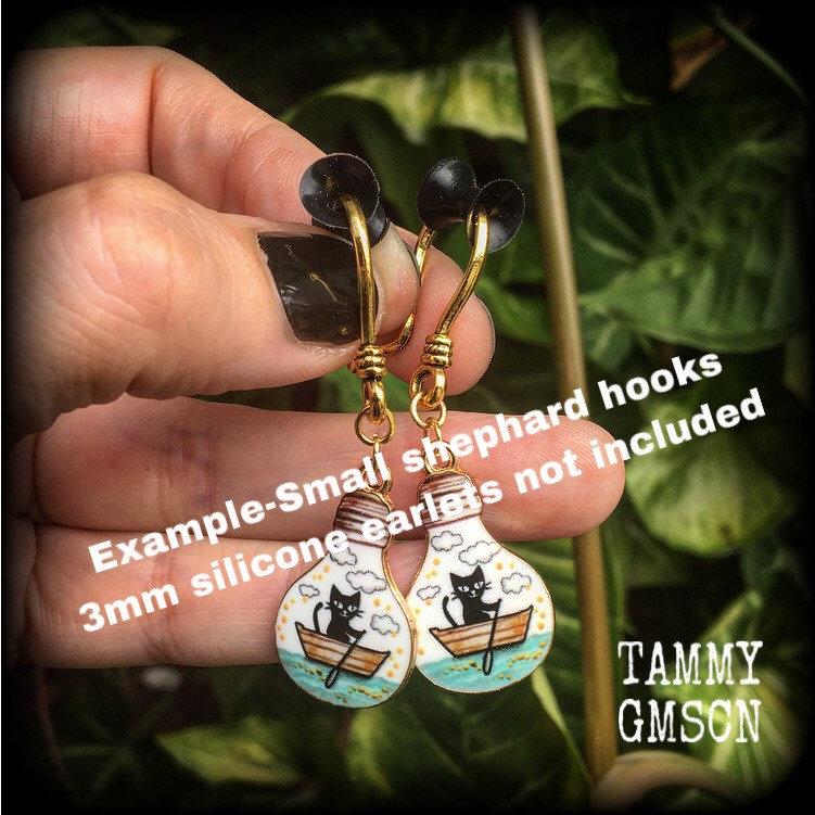 *I recommend shephard hooks be worn through silicone earlets in stretched lobes, they sit snug and look great, while chain and clasps are suitable to be worn through metal tunnels.