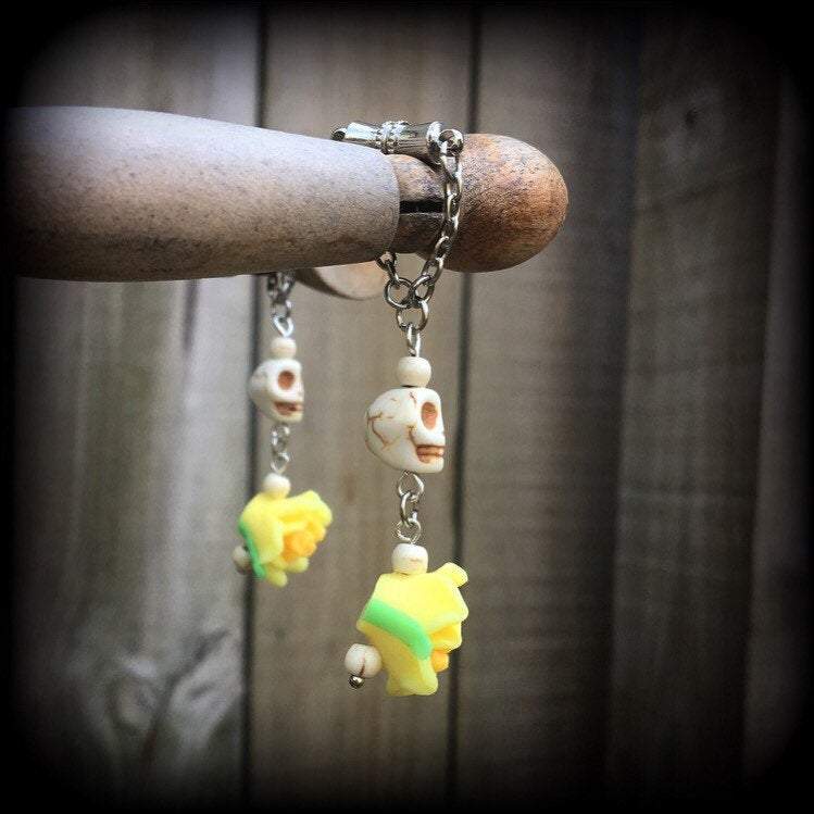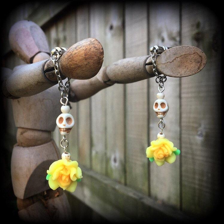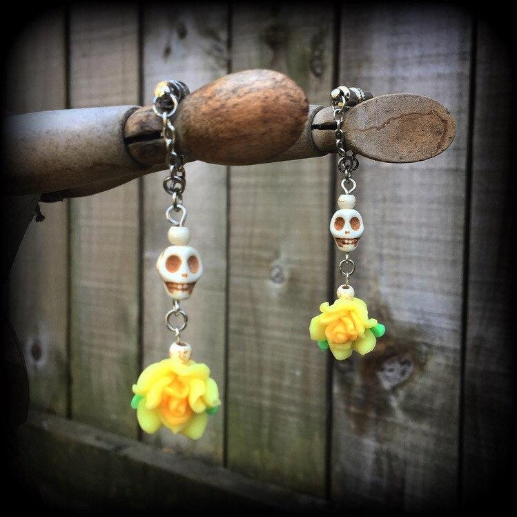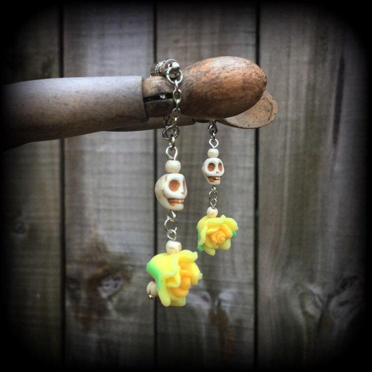 This is a lightweight pair of earrings (4grams each) featuring a gorgeous (polymer clay) orange and yellow coloured rose dangling beneath a bone white howlite stone skull, made with a 6mm magnetic clasp to be worn through silicone earlets or tunnels in stretched lobes from 2 gauge/6mm.