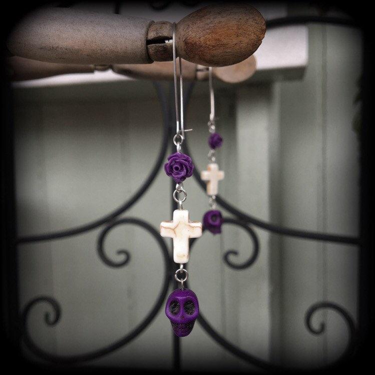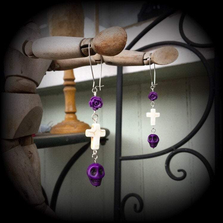 From my 'Sangria' range of Day of the Dead jewellery come these beautiful earrings made with one bone white howlite stone cross, hanging between a dark sangria purple rose and quaint stone skull.