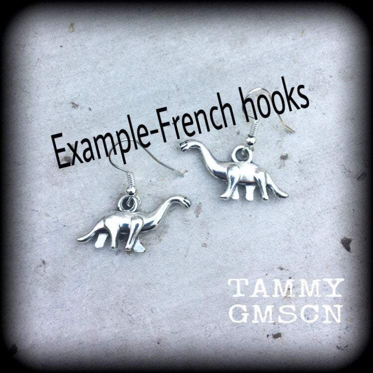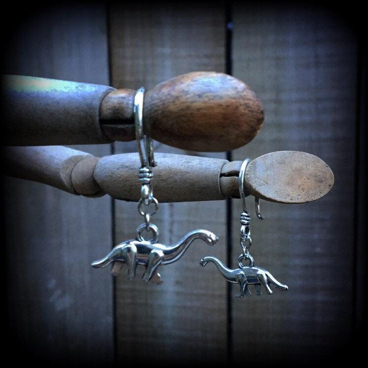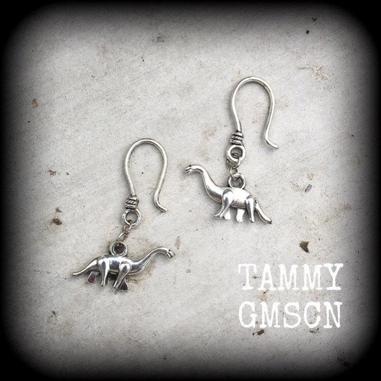 These cute little antique silver 'Diplodocus' earrings are light weight and nice and dangly, measuring just on 4cms, and made on small shephard hooks to be worn through stretched lobes with silicone earlest from 3mm/8 gauge.
