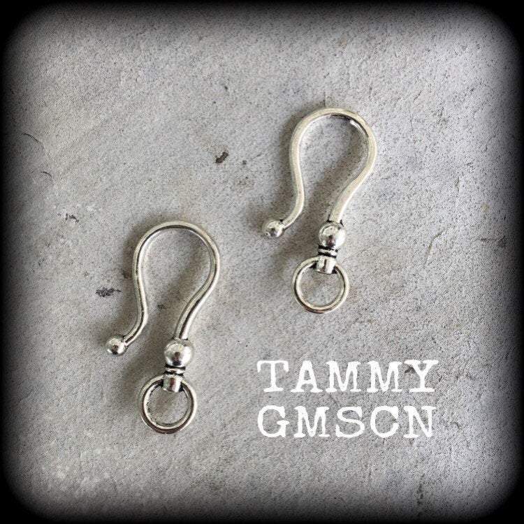 This listing is for one pair of large antique silver shephards hooks, suitable to be worn through stretched lobes in silicone earlets from 6mm and larger.