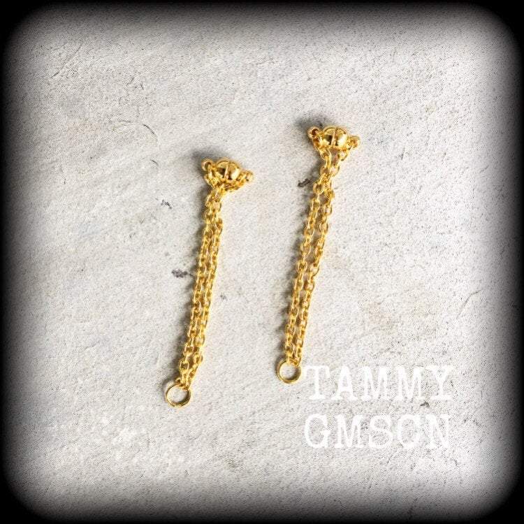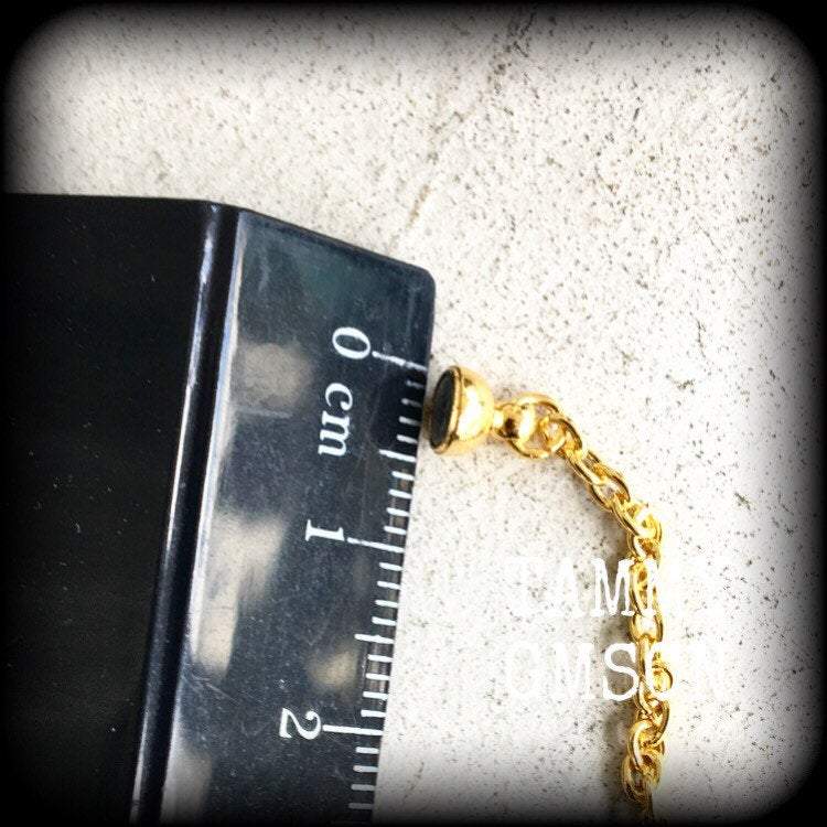 This listing is for one pair of Antique gold chain and magnetic ball clasp fittings, suitable for stretched lobes 6mm and 2 gauge. Please take note of the measurements shown in the photographs, and allow for the thickness of the silicone earlets.