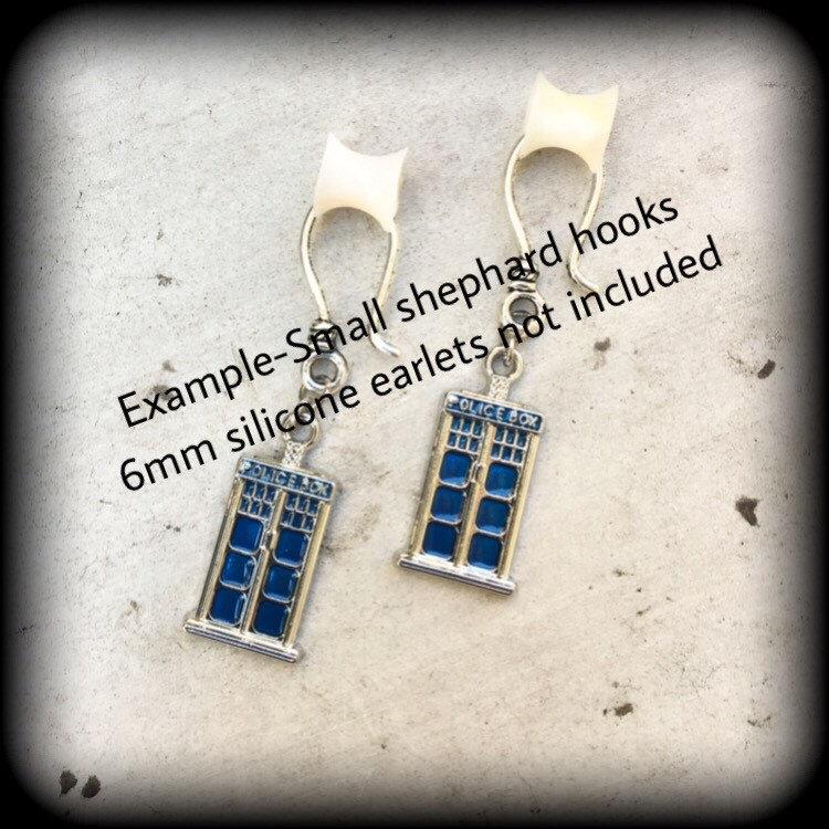 *I recommend shephard hooks be worn through silicone earlets in stretched lobes, they sit snug and look great, while chain and clasps are suitable to be worn through metal tunnels or silicone earlets.