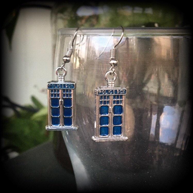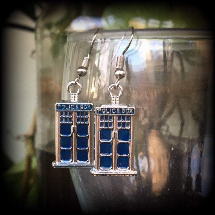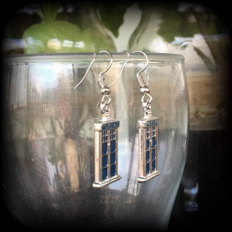 These cute little antique silver 'Tardis' earrings are light weight and nice and dangly, measuring just on 4.5cm, and made on antique silver french hooks, to be worn in pierced ears.
