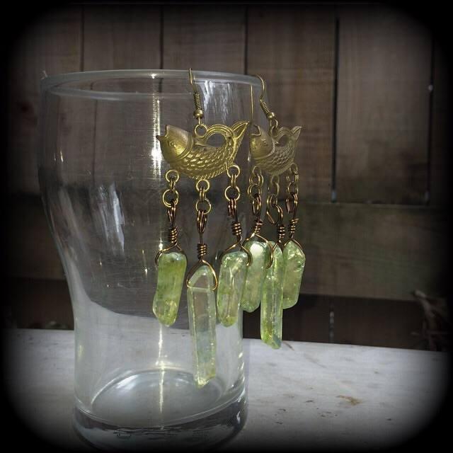 Measuring just on 9.5cms from tip to tip, this pair of 'Innsmouth' earrings feature seagreen titanium coated druzy crystal points, dangling from antique bronze fish charms, made on an antique bronze french hook to be worn through pierced ears.