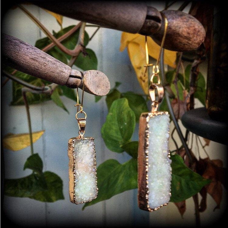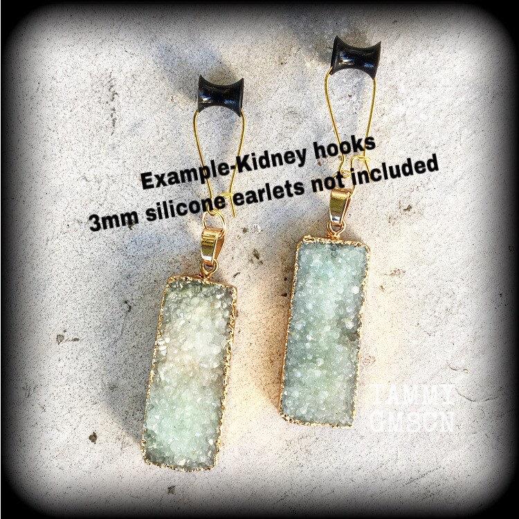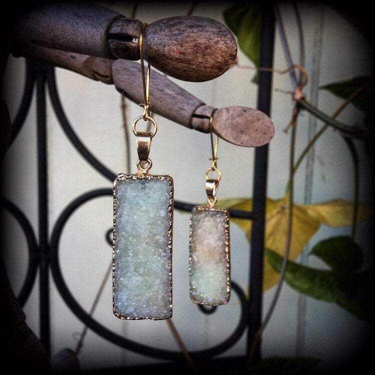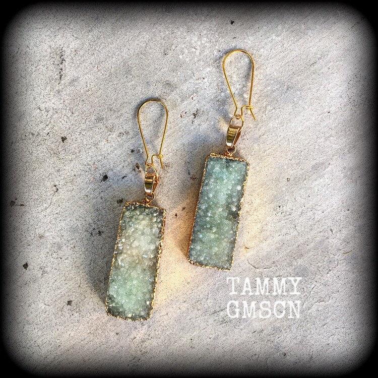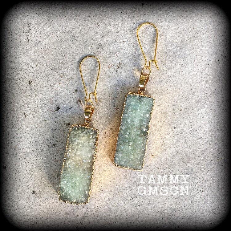From the Gemstone Fossil and Wood range are the gorgeous sea foam green druzy gem earrings, made with antique gold kidney hooks, to be worn in pierced ears or through silicone earlets in stretched lobes.
