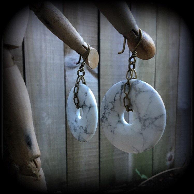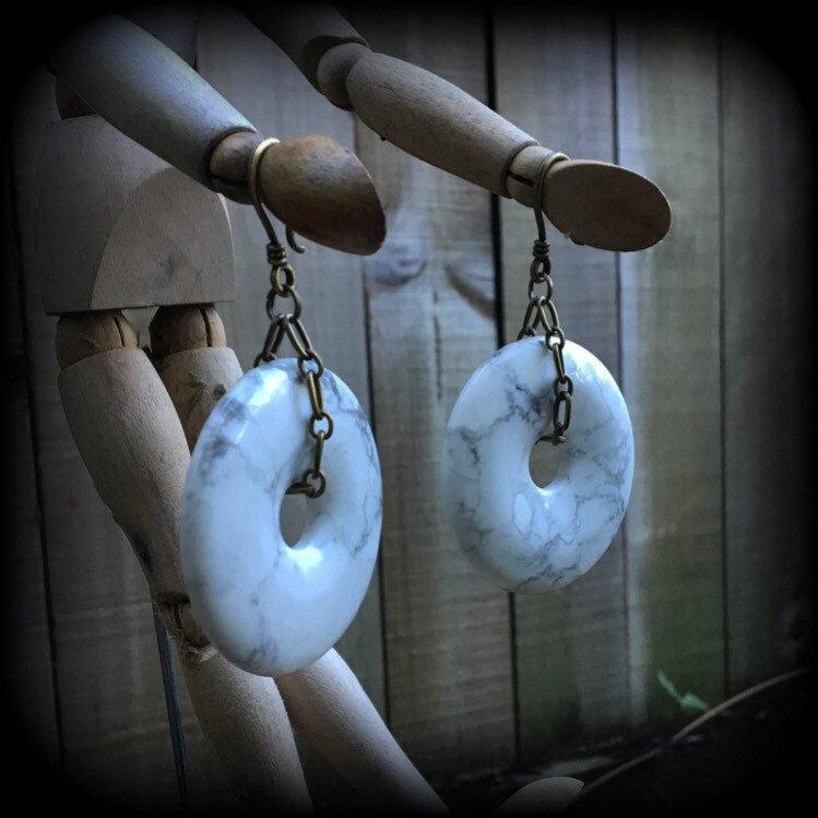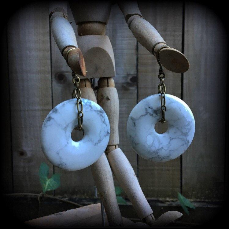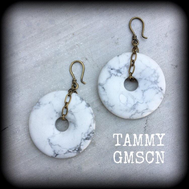 These is a pair of gorgeous minamalist White Howlite Ear weights, made with antique bronze chain and small antique bronze shephards hooks, to be worn specifically through silicone earlets in stretched lobes.