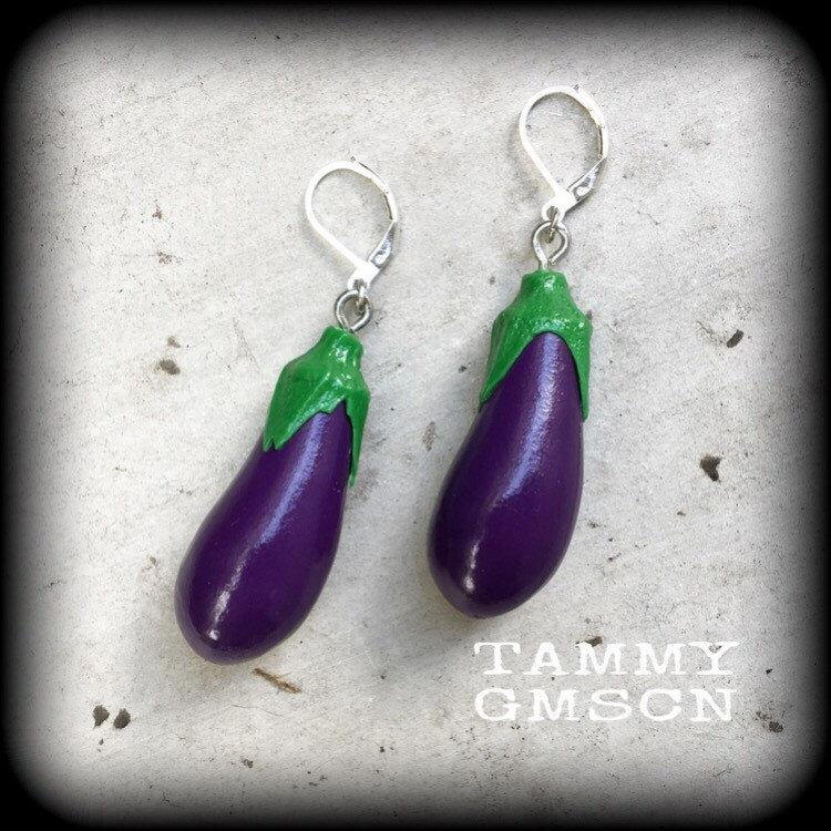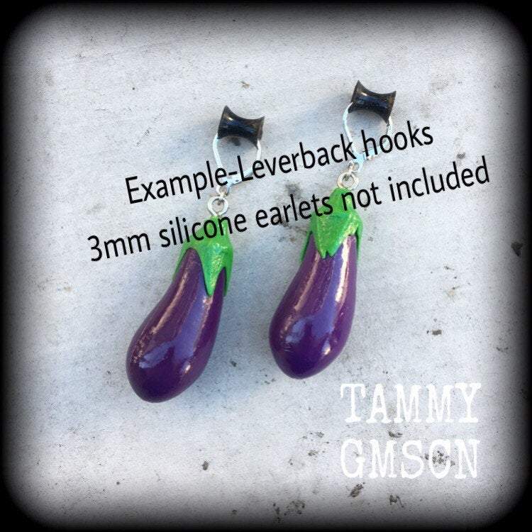 This pair of luscious purple 'Emoji Eggplant' earrings measures just on 7cms from tip to tip made with antique silver leverback hooks, to be worn through pierced ears or stretched lobes with silicone earlets.