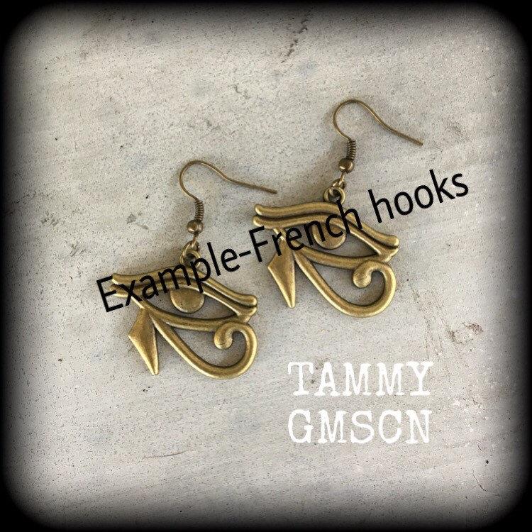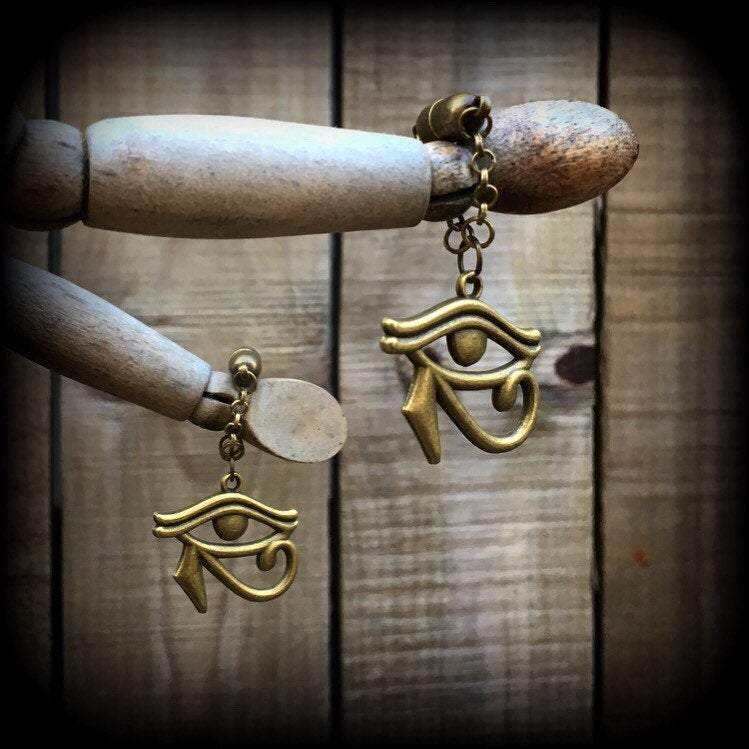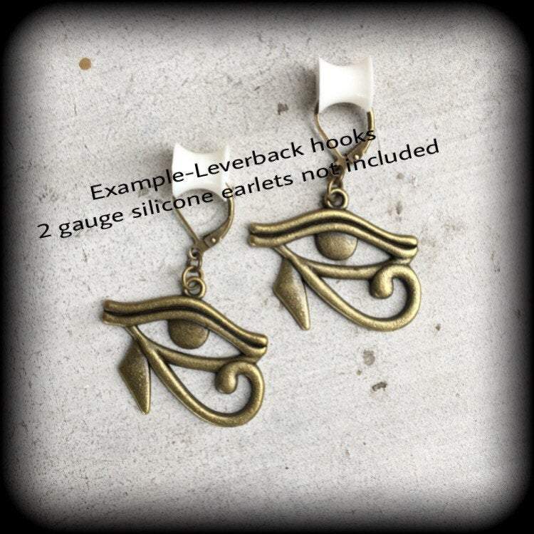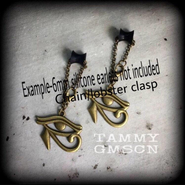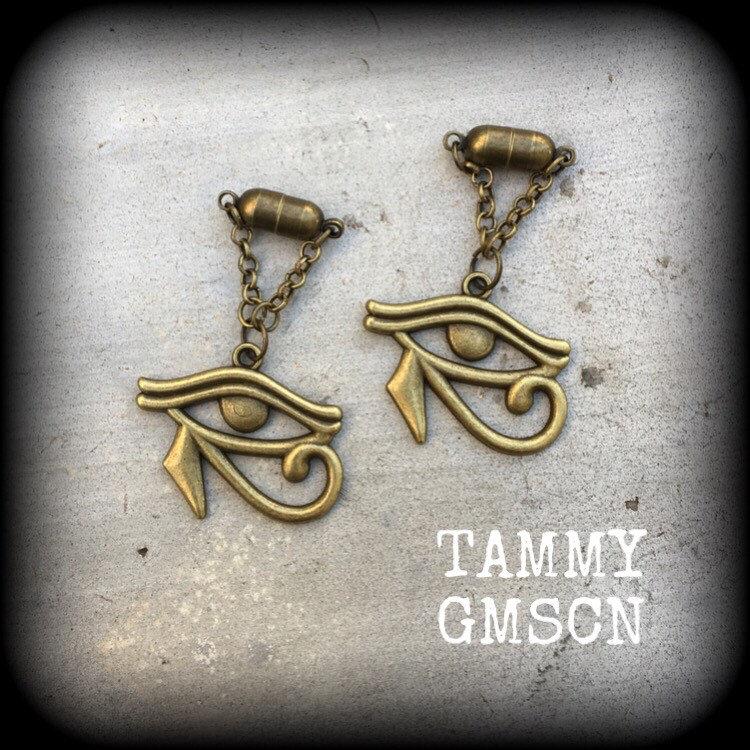 The 'Eye of Horus' plug dangles measure just on 4cms, nice and light weight and made with antique bronze chain and magnetic clasp, to fit snug in silicone earlets in stretched lobes.