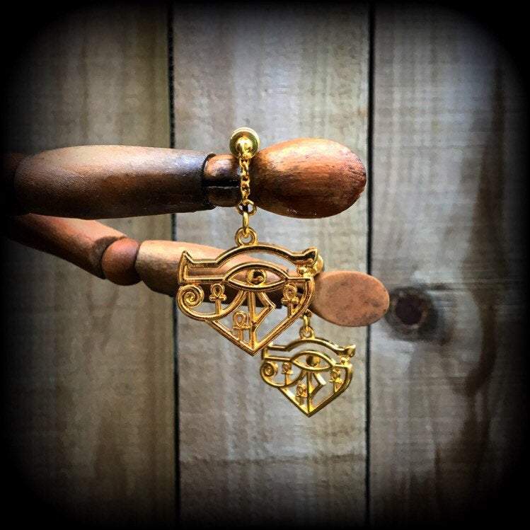 The 'Eye of Horus' earrings measure just on 5cms, nice and light weight at 8 grams each, suitable for both pierced ears and stretched lobes.