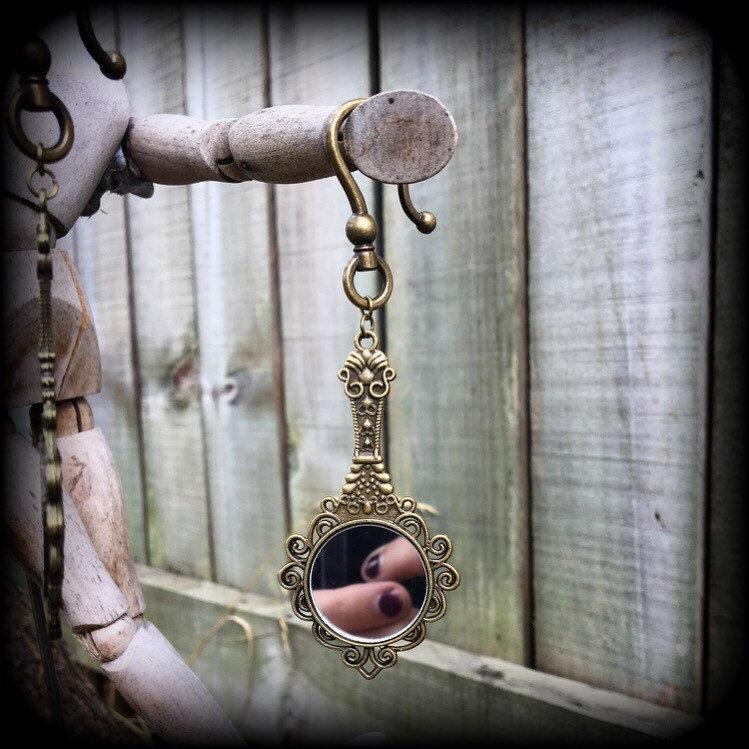 These beautiful Wanderlust 'Mirror Mirror' antique bronze ornate 'Fairy Tale' Mirror tunnel dangles are made on large antique bronze shephard hooks, to be worn though silicone earlets specifically for stretched lobes.